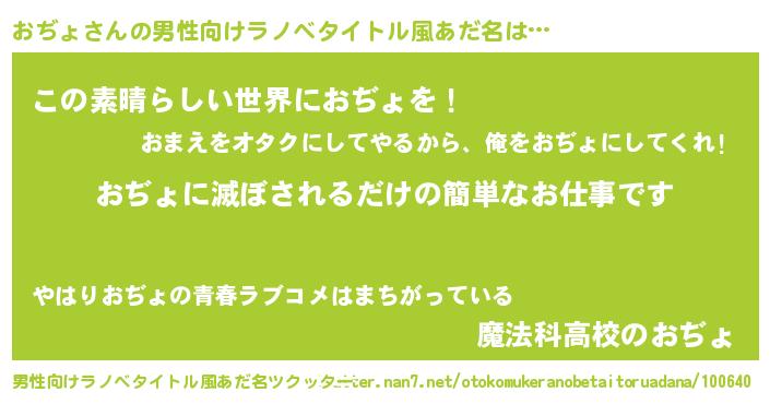 | 胡散臭い通販商品みたいなあだ名 | 『あなたにだけ特別に提供する世界で10本だけ現存している希少なブランデー…その名も「おぢょ」』 |