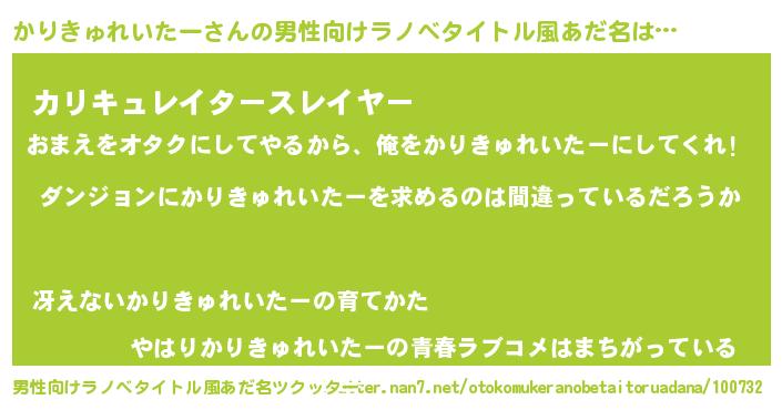 かりきゅれいたーさんの男性向けラノベタイトル風あだ名をツクッター!