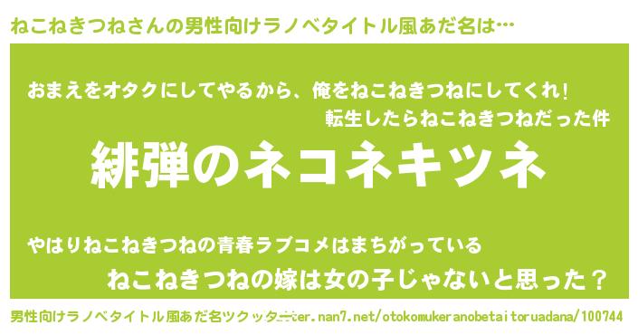 | 胡散臭い通販商品みたいなあだ名 | 『100人中100人が認めたイリジウム磁石…その名も「ねこねきつね」』 |