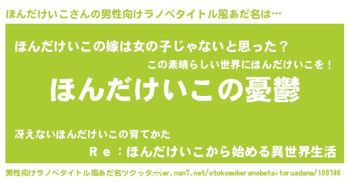 | 女子向けラノベタイトル風あだ名 | 『(仮)ほんだけいこのやんごとなき事情』 |