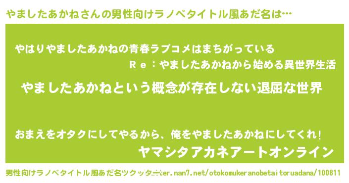 | 女子向けラノベタイトル風あだ名 | 『異世界で失敗しない100のやましたあかね』 |