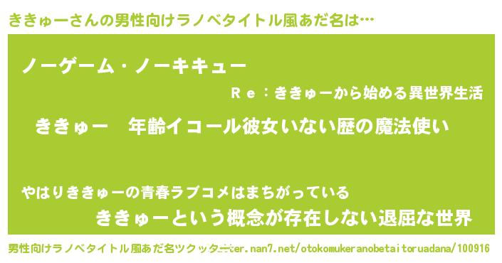 | 女子向けラノベタイトル風あだ名 | 『ききゅーの玉の輿計画!』 |