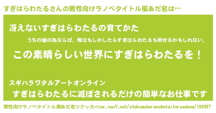 | 意味不明あだ名 | 『住所不定無職すぎはらわたる(79歳)』 |