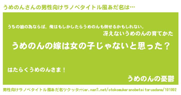 | 女子向けラノベタイトル風あだ名 | 『うめのんの卵を拾いまして』 |