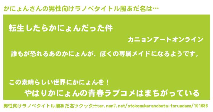 | 胡散臭い通販商品みたいなあだ名 | 『来世でも幸せになれる健康食品…その名も「かにょん」』 |