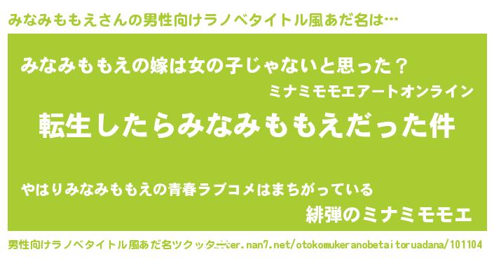 | 女子向けラノベタイトル風あだ名 | 『みなみももえの玉の輿計画!』 |