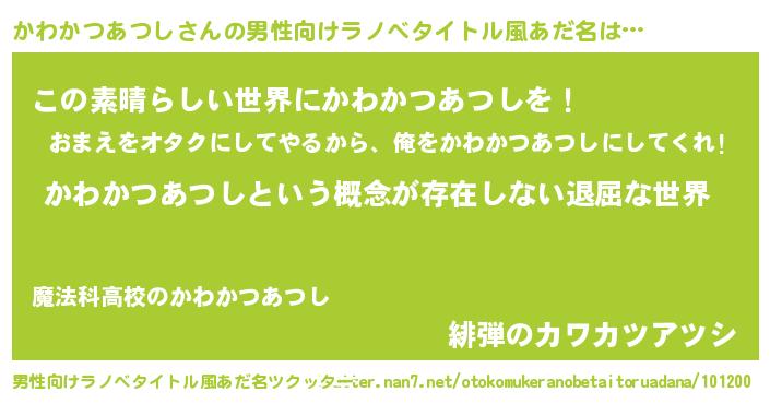 | 女子向けラノベタイトル風あだ名 | 『異世界で失敗しない100のかわかつあつし』 |