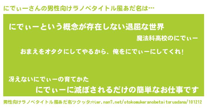| 女子向けラノベタイトル風あだ名 | 『にでぃー夫妻のなれそめ』 |