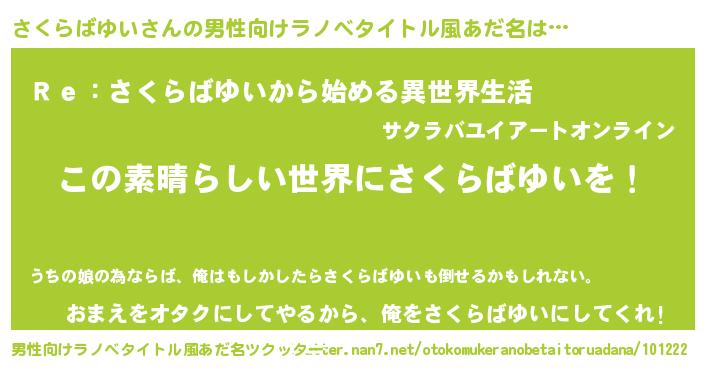 | 恥ずかしいあだ名 | 『サクラバユイデラックス』『さくっちょ』 |