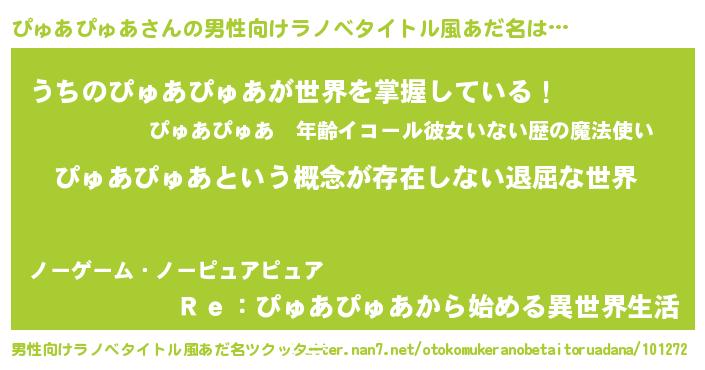 | 女子向けラノベタイトル風あだ名 | 『異世界で失敗しない100のぴゅあぴゅあ』 |