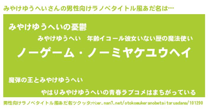 | 女子向けラノベタイトル風あだ名 | 『死神みやけゆうへいの再婚』 |