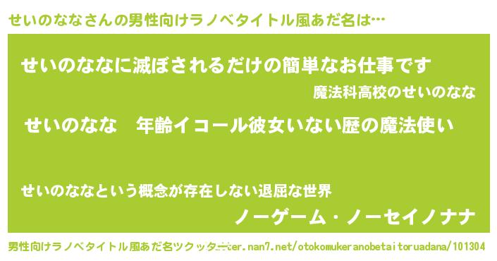 | 女子向けラノベタイトル風あだ名 | 『せいのななの玉の輿計画!』 |
