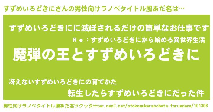 | 女子向けラノベタイトル風あだ名 | 『すずめいろどきにが死なない童話 林檎のすずめいろどきにの診療簿』 |