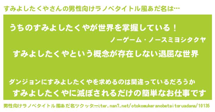 | 女子向けラノベタイトル風あだ名 | 『異世界で失敗しない100のすみよしたくや』 |