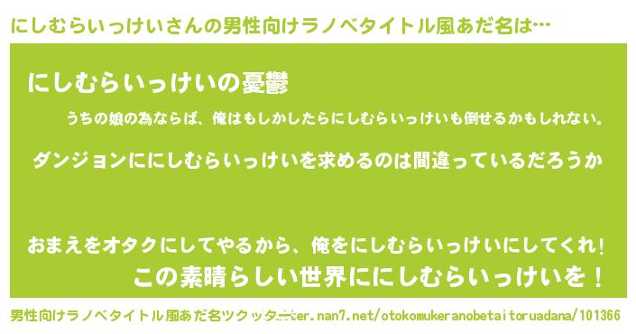 | 女子向けラノベタイトル風あだ名 | 『にしむらいっけいの卵を拾いまして』 |