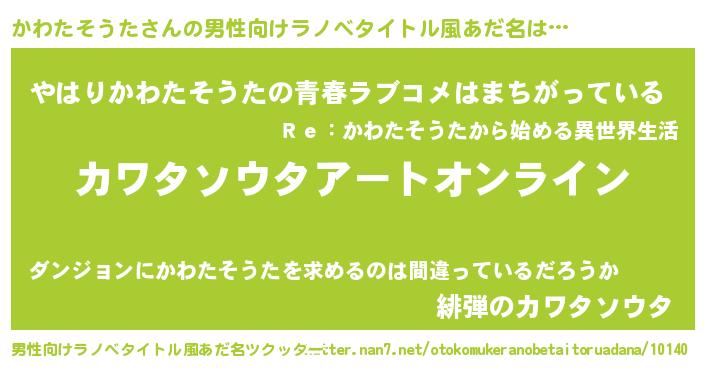 | 胡散臭い通販商品みたいなあだ名 | 『億万長者になれるブレスレット…その名も「かわたそうた」』 |