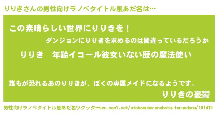 | 胡散臭い通販商品みたいなあだ名 | 『あなたにだけ特別に提供する限定10本のレアな日本酒…その名も「りりき」』 |