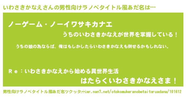 | 女子向けラノベタイトル風あだ名 | 『いわさきかなえ伯爵の花嫁』 |