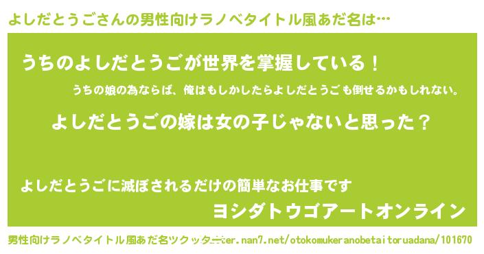 | 女子向けラノベタイトル風あだ名 | 『よしだとうご様がみてる』 |