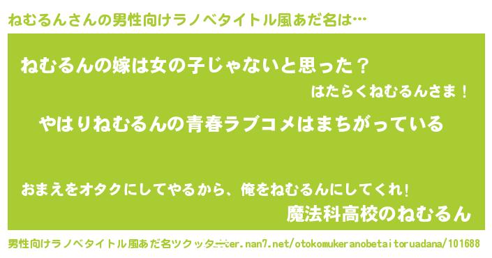 | 女子向けラノベタイトル風あだ名 | 『ねむるん伯爵の花嫁』『ねむるん恋絵巻』 |