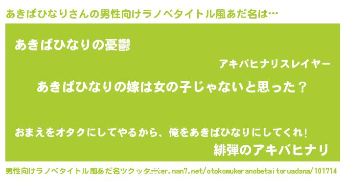 | 女子向けラノベタイトル風あだ名 | 『あきばひなり様がみてる』 |