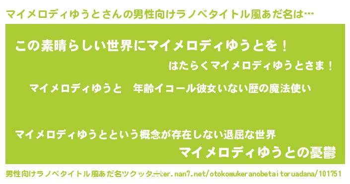 | 女子向けラノベタイトル風あだ名 | 『マイメロディゆうとの玉の輿計画!』 |