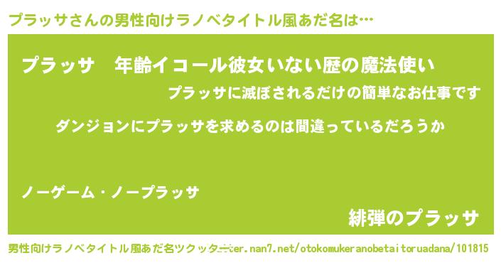 | 女子向けラノベタイトル風あだ名 | 『プラッサの卵を拾いまして』 |
