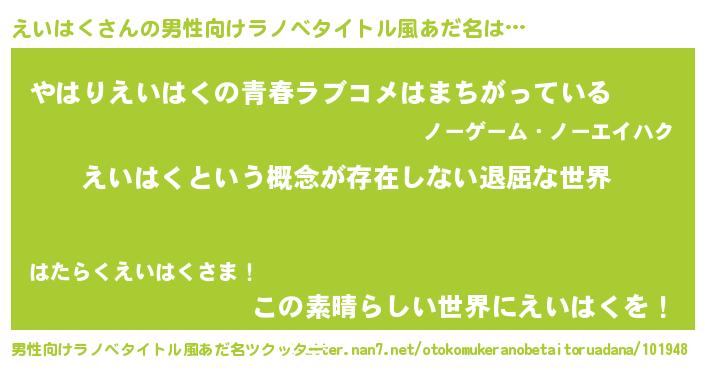 | 胡散臭い通販商品みたいなあだ名 | 『絶対に幸福をもたらす水素水…その名も「えいはく」』 |