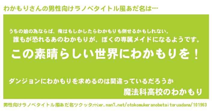 | 胡散臭い通販商品みたいなあだ名 | 『あなたにだけ特別に提供する世界で10本だけ現存している希少なブランデー…その名も「わかもり」』 |