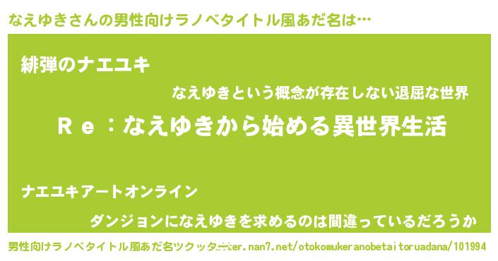 | ヒーロー風カッコイイあだ名 | 『サイバー戦士ナエユキ』『魔戒騎士ナエ』 |
