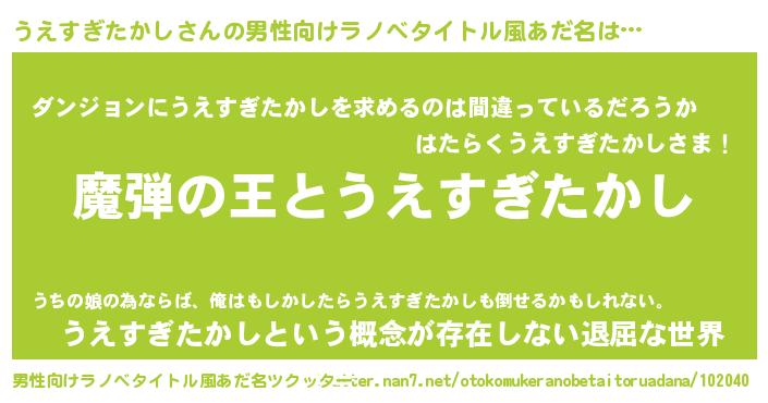 | 女子向けラノベタイトル風あだ名 | 『うえすぎたかしが死なない童話 林檎のうえすぎたかしの診療簿』 |