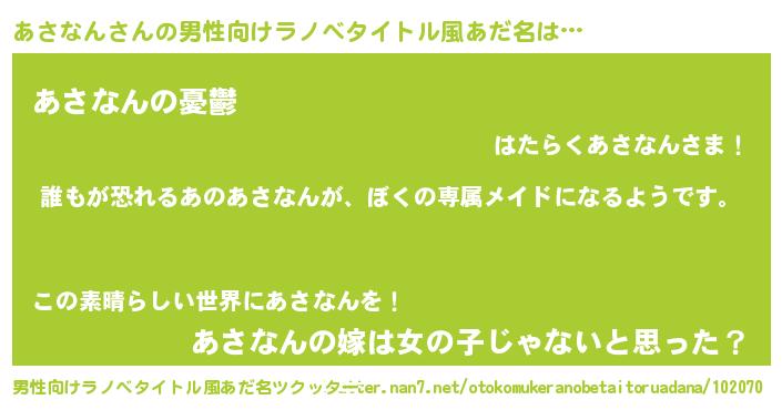 | 女子向けラノベタイトル風あだ名 | 『異世界でカフェあさなんを開店しました。』 |