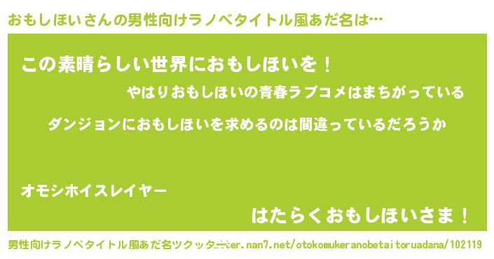 | 女子向けラノベタイトル風あだ名 | 『おもしほいの卵を拾いまして』 |