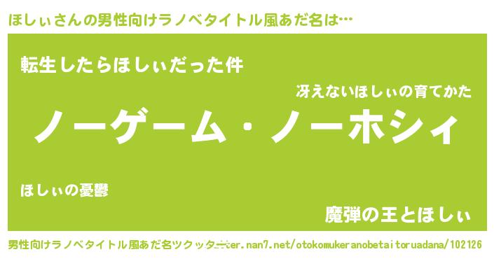 | 女子向けラノベタイトル風あだ名 | 『死神ほしぃの再婚』 |