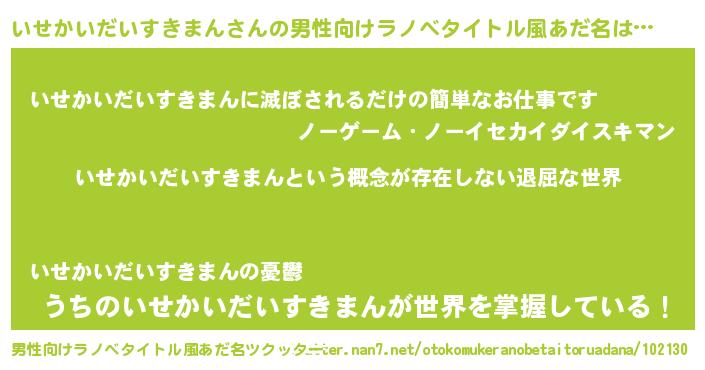 | 女子向けラノベタイトル風あだ名 | 『異世界で失敗しない100のいせかいだいすきまん』 |
