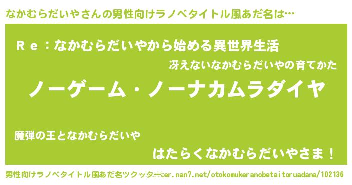 | 女子向けラノベタイトル風あだ名 | 『死神なかむらだいやの再婚』 |