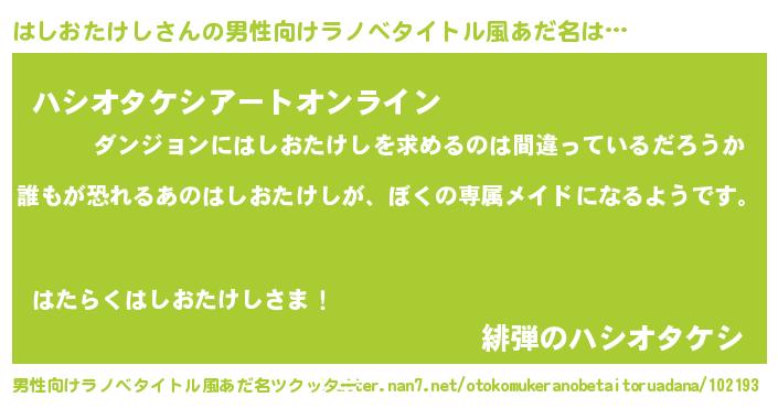 | 女子向けラノベタイトル風あだ名 | 『異世界でカフェはしおたけしを開店しました。』 |