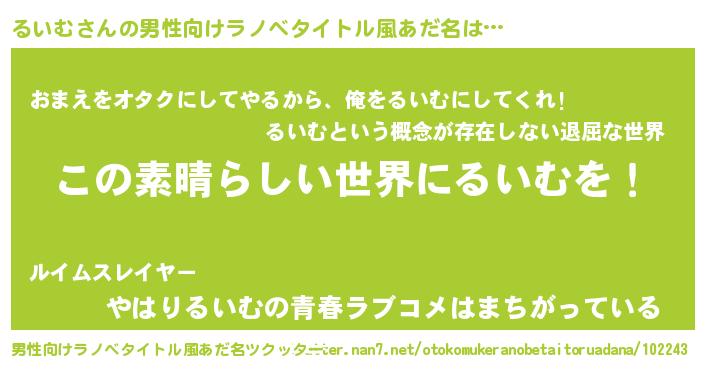 | 女子向けラノベタイトル風あだ名 | 『悪役るいむに転生したようですが、知った事ではありません』 |