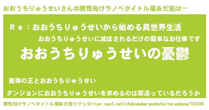 | 女子向けラノベタイトル風あだ名 | 『(仮)おおうちりゅうせいのやんごとなき事情』 |
