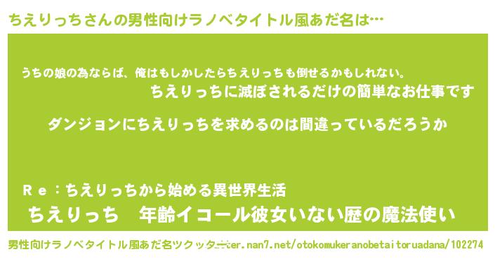 | 女子向けラノベタイトル風あだ名 | 『ちえりっちの卵を拾いまして』 |