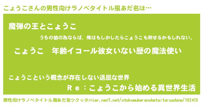 | 女子向けラノベタイトル風あだ名 | 『こょうこの玉の輿計画!』 |