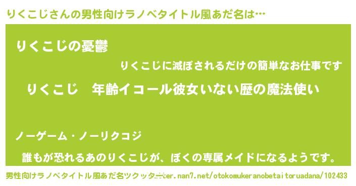 | 女子向けラノベタイトル風あだ名 | 『りくこじの玉の輿計画!』 |