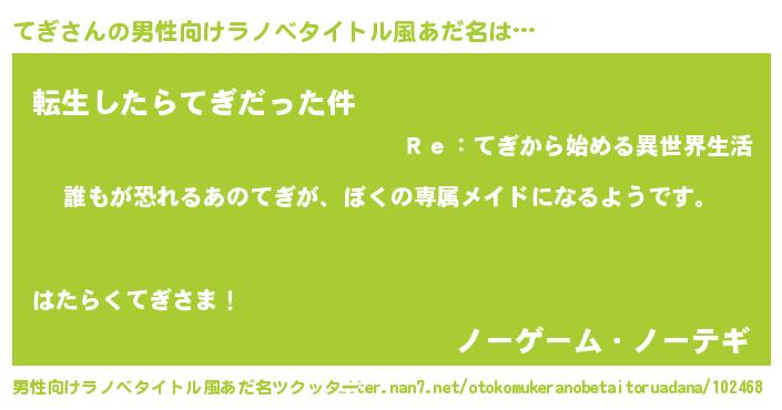 | 女子向けラノベタイトル風あだ名 | 『異世界でカフェてぎを開店しました。』 |