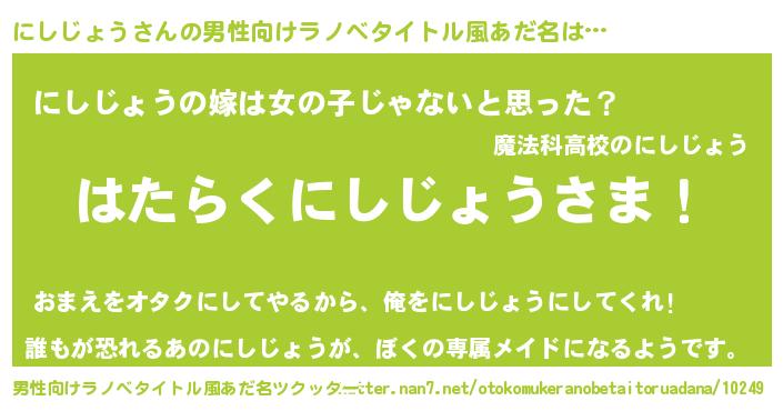 | 胡散臭い通販商品みたいなあだ名 | 『信頼と実績のサプリメント…その名も「にしじょう」』 |