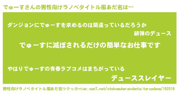 | ヒーロー風カッコイイあだ名 | 『幻影騎士デュ』『ウルトラでゅーすマン』 |
