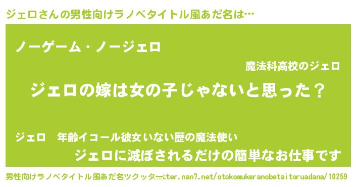 | 女子向けラノベタイトル風あだ名 | 『ジェロの卵を拾いまして』 |