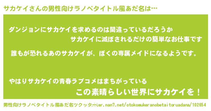 | 胡散臭い通販商品みたいなあだ名 | 『来世でも幸せになれる水素水…その名も「サカケイ」』 |