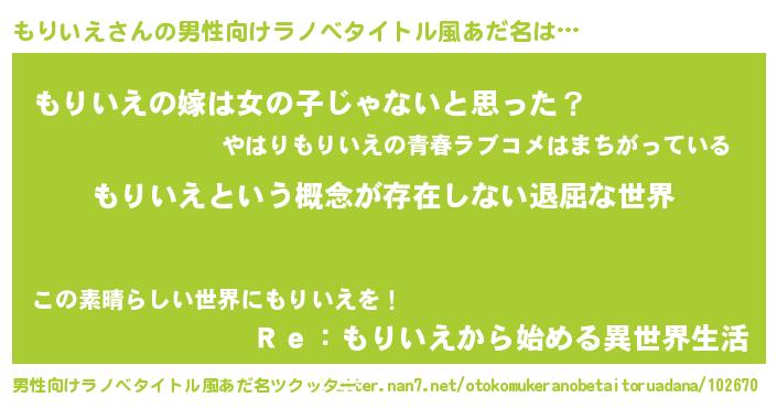 | 女子向けラノベタイトル風あだ名 | 『異世界で失敗しない100のもりいえ』 |