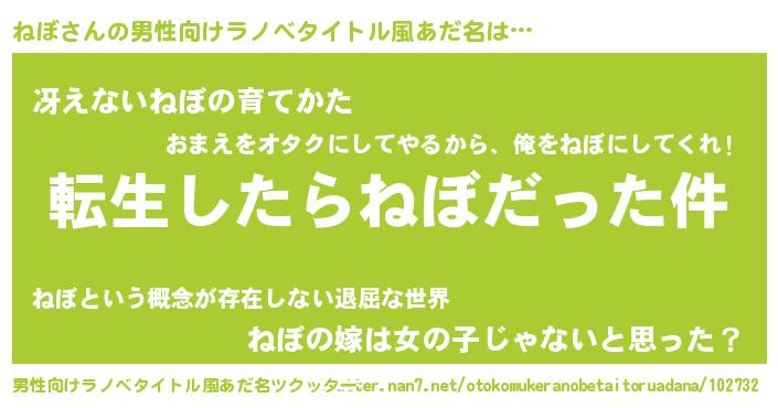 | 女子向けラノベタイトル風あだ名 | 『ねぼの玉の輿計画!』『ねぼ様がみてる』 |