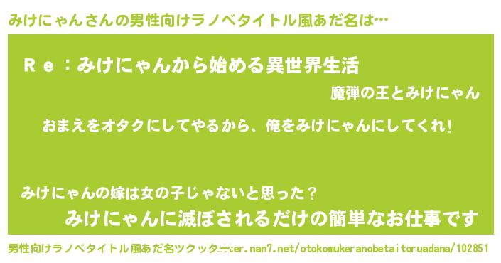 | 女子向けラノベタイトル風あだ名 | 『みけにゃん夫妻のなれそめ』 |